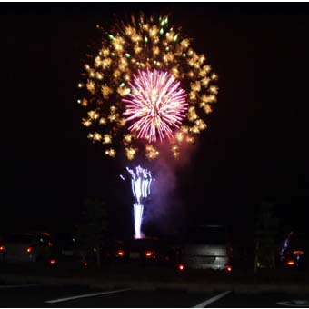 ぼん、ひゅるるるるる、ばん・・・ぼん、ぼん、ひぃゅるるるるる、ばん、どかん、バラバラバラバラバラ・・・