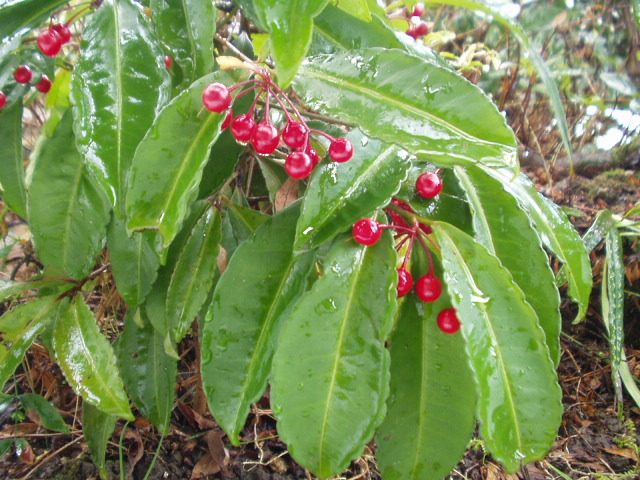 この家の母屋の表のささやかな庭に、一本の小さなマンリョウ(万両)の木が植わっている。ワタシがこの家に越してくる以前から植えられていたものだ。背丈はひざ上くらいまでしかないが、真冬にも緑の葉を茂らせ、小さなサクランボのような赤い実を付ける。ワタシはこの木の名前を知らなかったのだが、植物にたいへん詳しいご婦人に名前を教わってから、その可憐な姿がたいへんお気に入りとなっている。