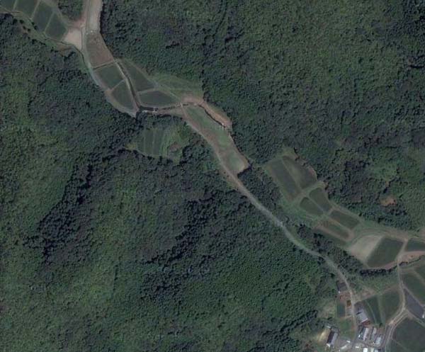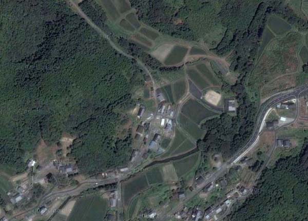 次の写真は、ワタシの家からウチの田んぼまでの小道を写したものだ。左上に何枚か連なっている田んぼのうちの、いちばん道側の白くなっているところがウチの田んぼだ。右下のワタシの家から田んぼまでの距離は約600m。普通に歩いて約8、9分。