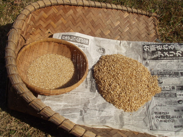 初めて自分たちで作った銘柄も定かでないお米は、摺りたて、つきたて、炊きたてという「3たて」のぜいたくこの上ないご飯になった。炊飯器のフタを開けて、ご婦人とふたりで顔を近づけた。その瞬間湧き立ってきた、例えようもない香ばしい香り・・・は、なかった。普通のご飯の香りだ。それよりも、炊飯器の中を見てがっかり。水が多すぎたようで、べちゃっとしている。新米だから、水は少し控えめにしたつもりだったのだが。