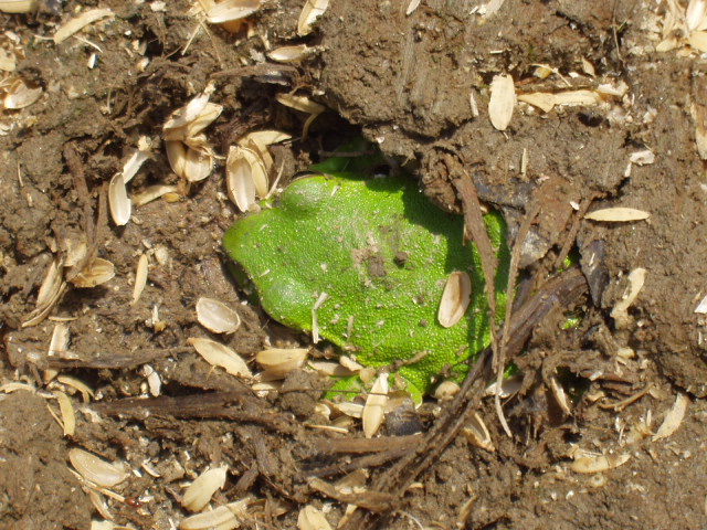 きょう、マイ田んぼで苗代を作っていると、土中からきれいな緑色の物体が出てきた。冬眠中のモリアオガエルだった。仲間たちはとっくに起き出してクケケェ、クケケェと鳴いているのに、寝坊なヤツだ。取りあえず、間一髪、この子の上にクワを振り下ろしてしまわなくてよかった。この子は地上で暮らすべき生き物だからな。が、畑や田んぼで冬眠中の生き物が災難に遭うことは避けられない。春先に出動する耕耘機なんか、大量破壊兵器そのものだ。きょうも農村では、あちこちでトラクターと田植機の轟音が響き渡っていたとさ。