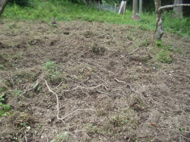 イノシシ一家が耕した所。そこは畑ではない。ひねてほとんど実を付けなくなった数本の栗の木の下には、何も植えられてはいない。であるのに、イノシシ一家は耕耘機となって見事に掘り返して回っていた。いったい何を食べたのか。