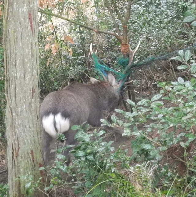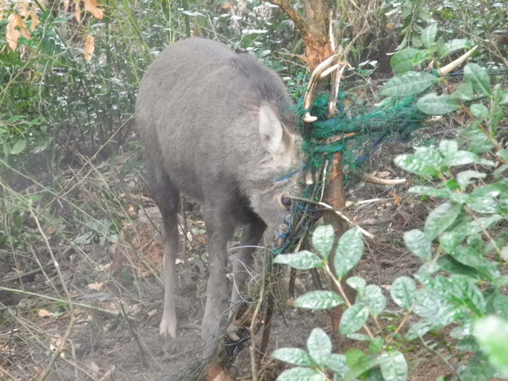 雄鹿が角をネットにからませて動けなくなることはよくある。