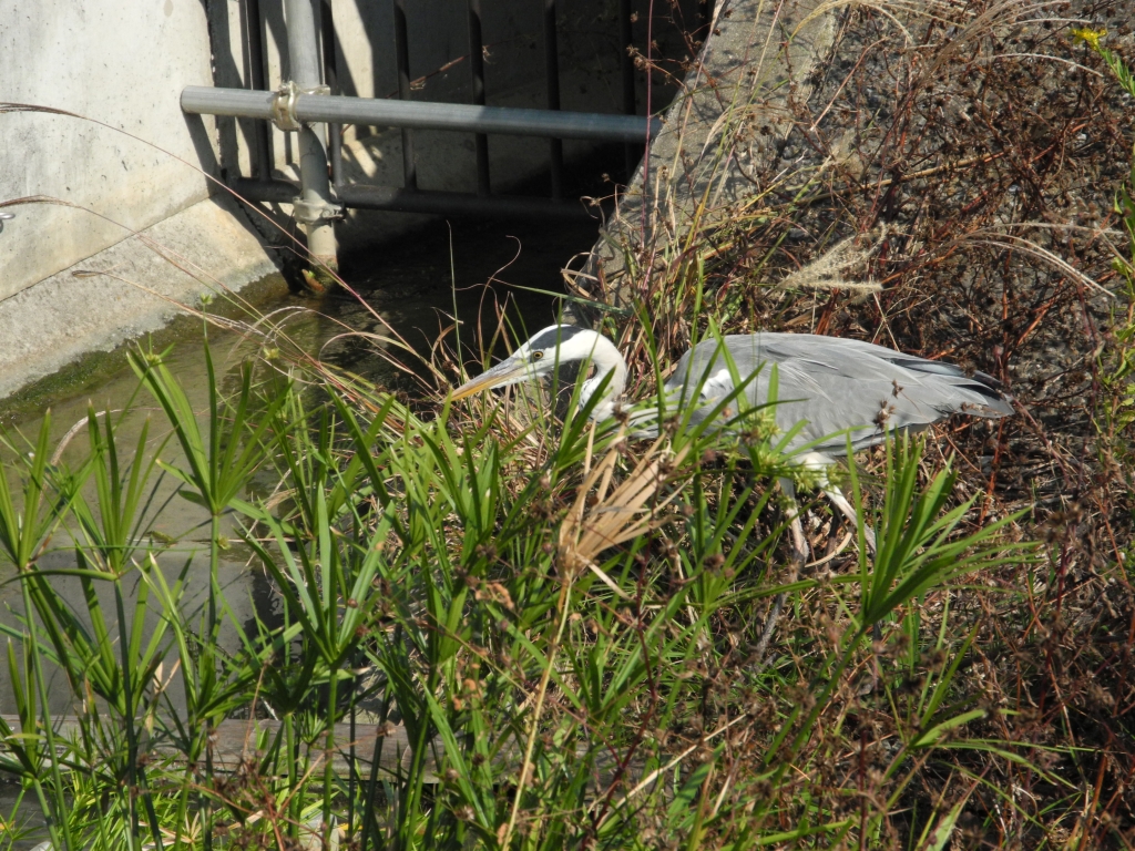 とっさに足を止めると、生い茂った草の向こう側にじっと静止している大きなアオサギの威容が眼に飛び込んできた。