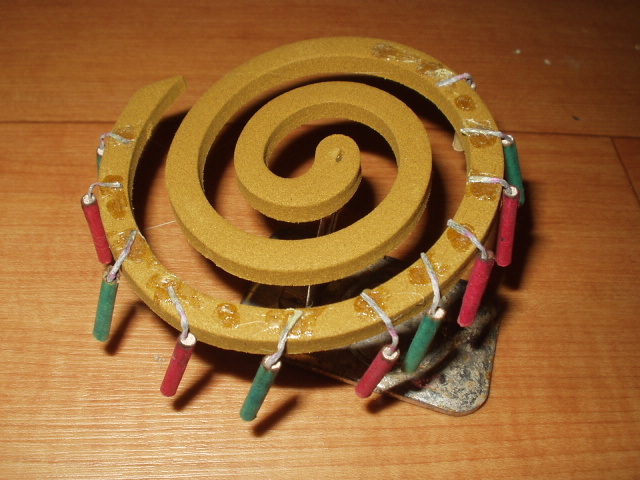 爆竹をバラして、森林香という山仕事用の分厚い虫取り線香にボンドで貼付けた「時限爆弾」だ。
