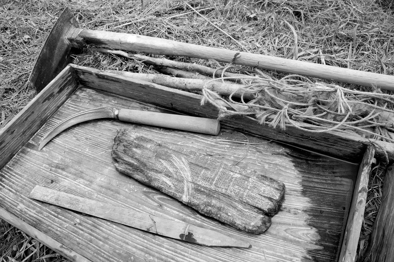 上から、苗を掘り出す鍬、自作の作付けヒモと支柱、苗を入れて運ぶ木箱、草を刈り苗を植える穴を掘る鋸鎌、苗を小分けにして乗せる板切れ、自作の竹製スケール。