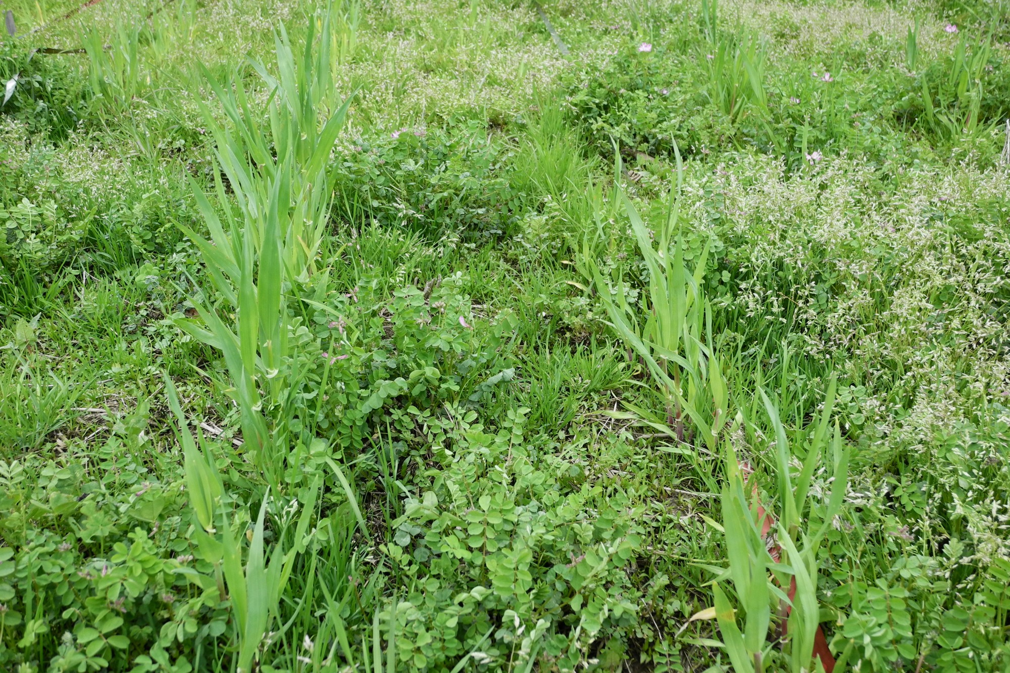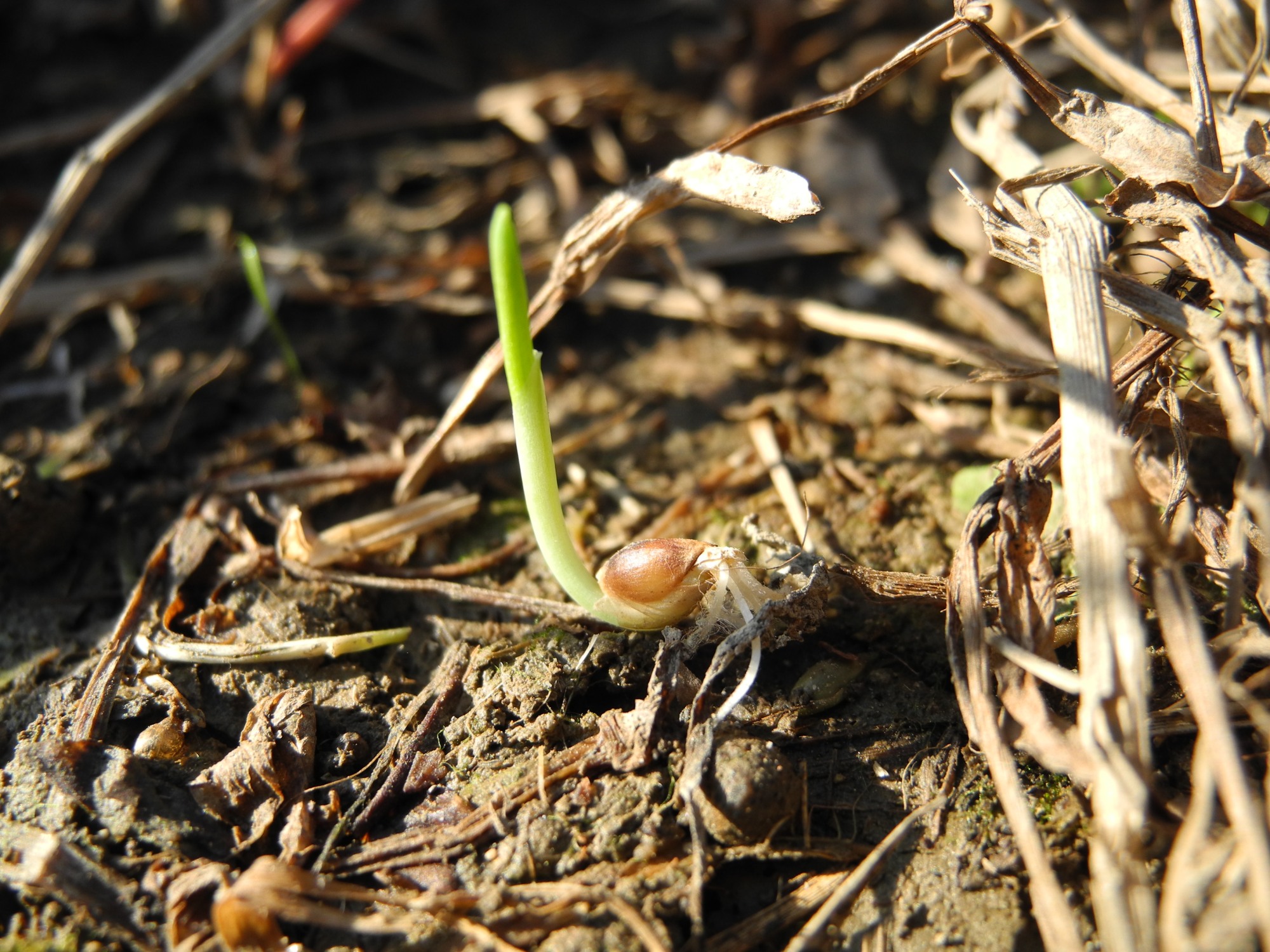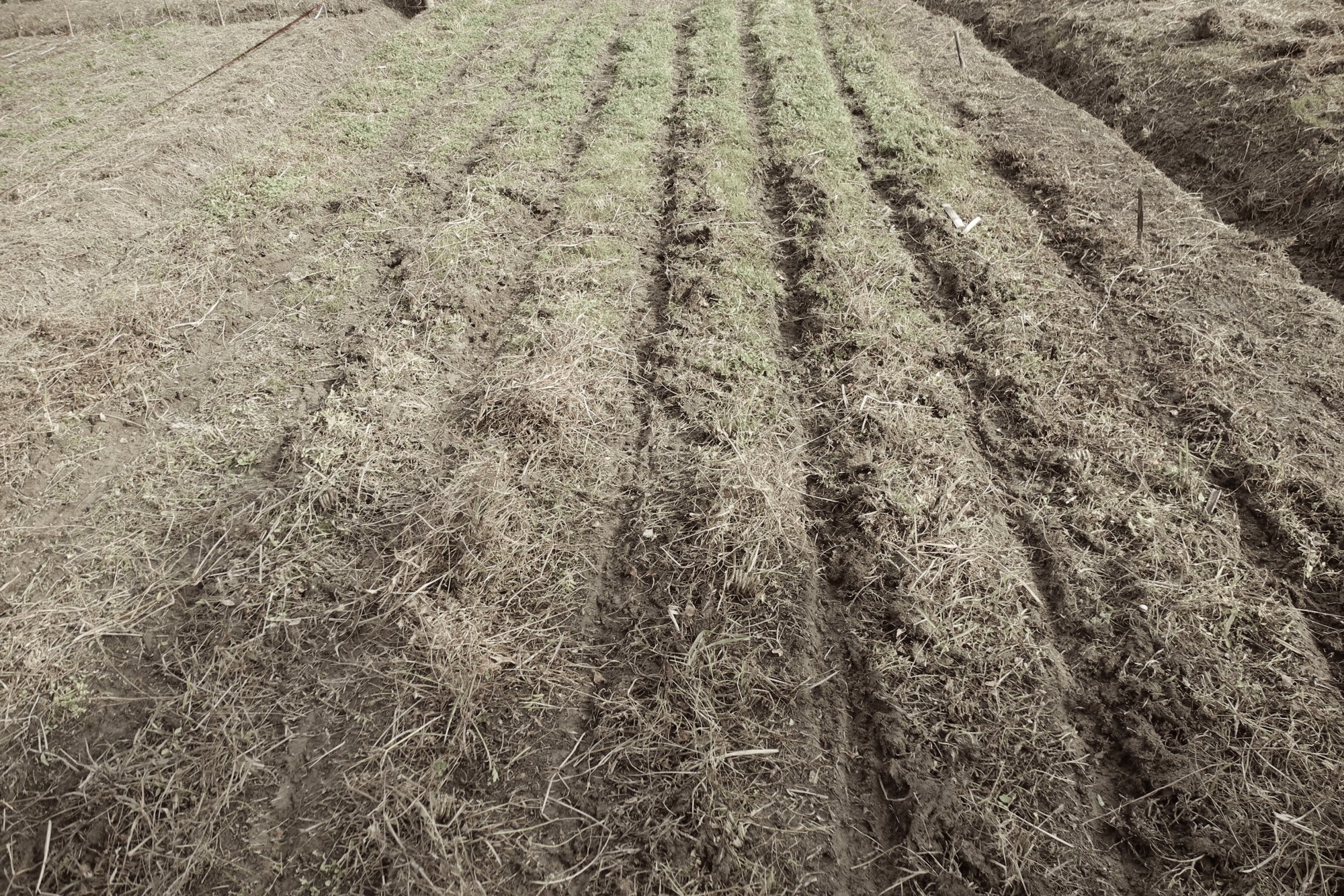 播く筋だけ草を刈っておき、10cm 間隔くらいに一粒ずつ播いていく。土は被せず、鳥除けに草だけ被せる。