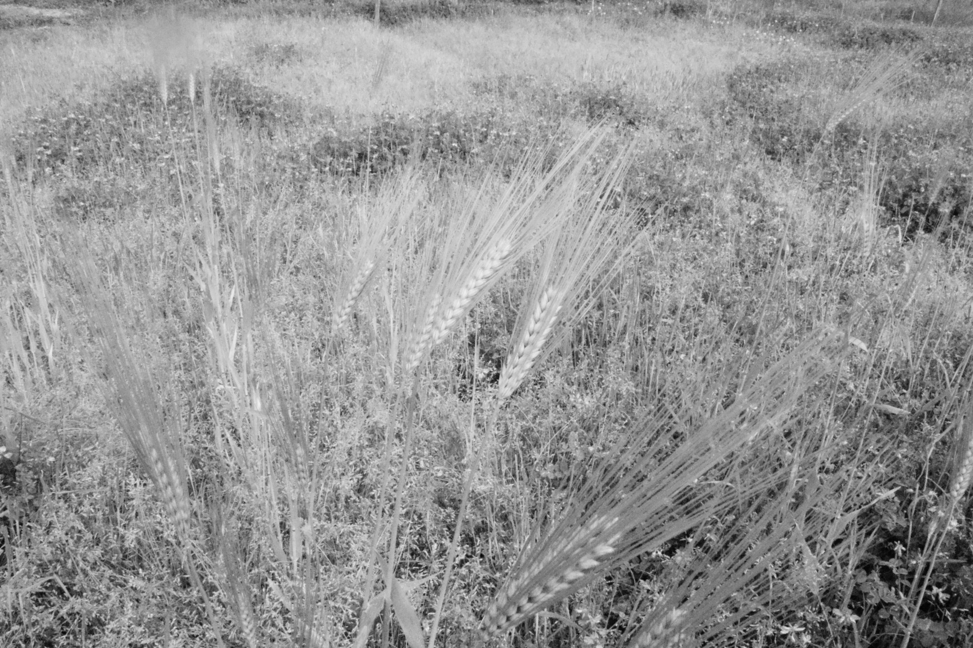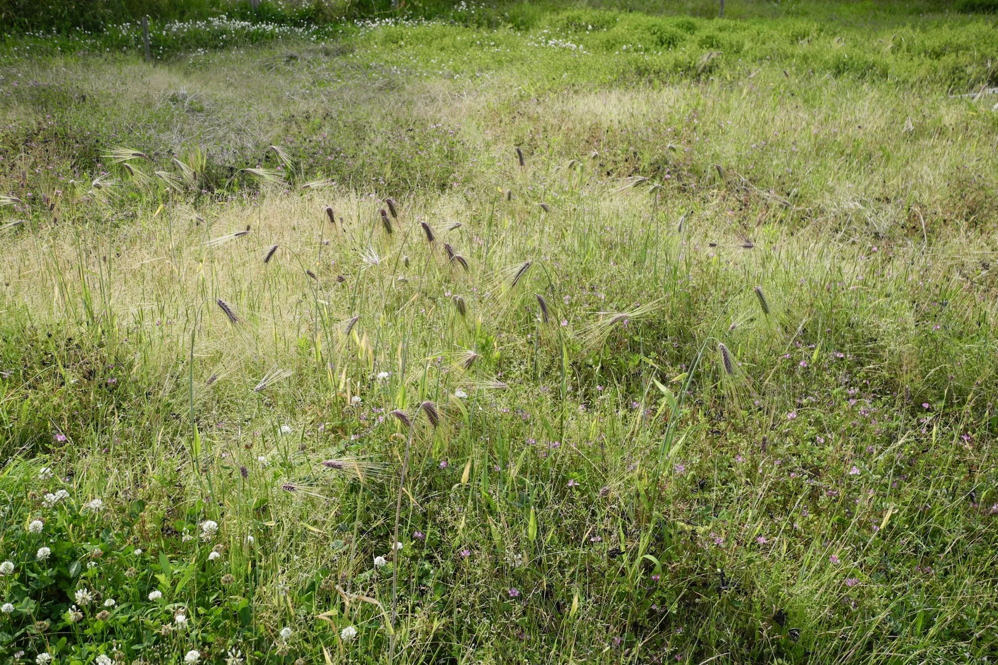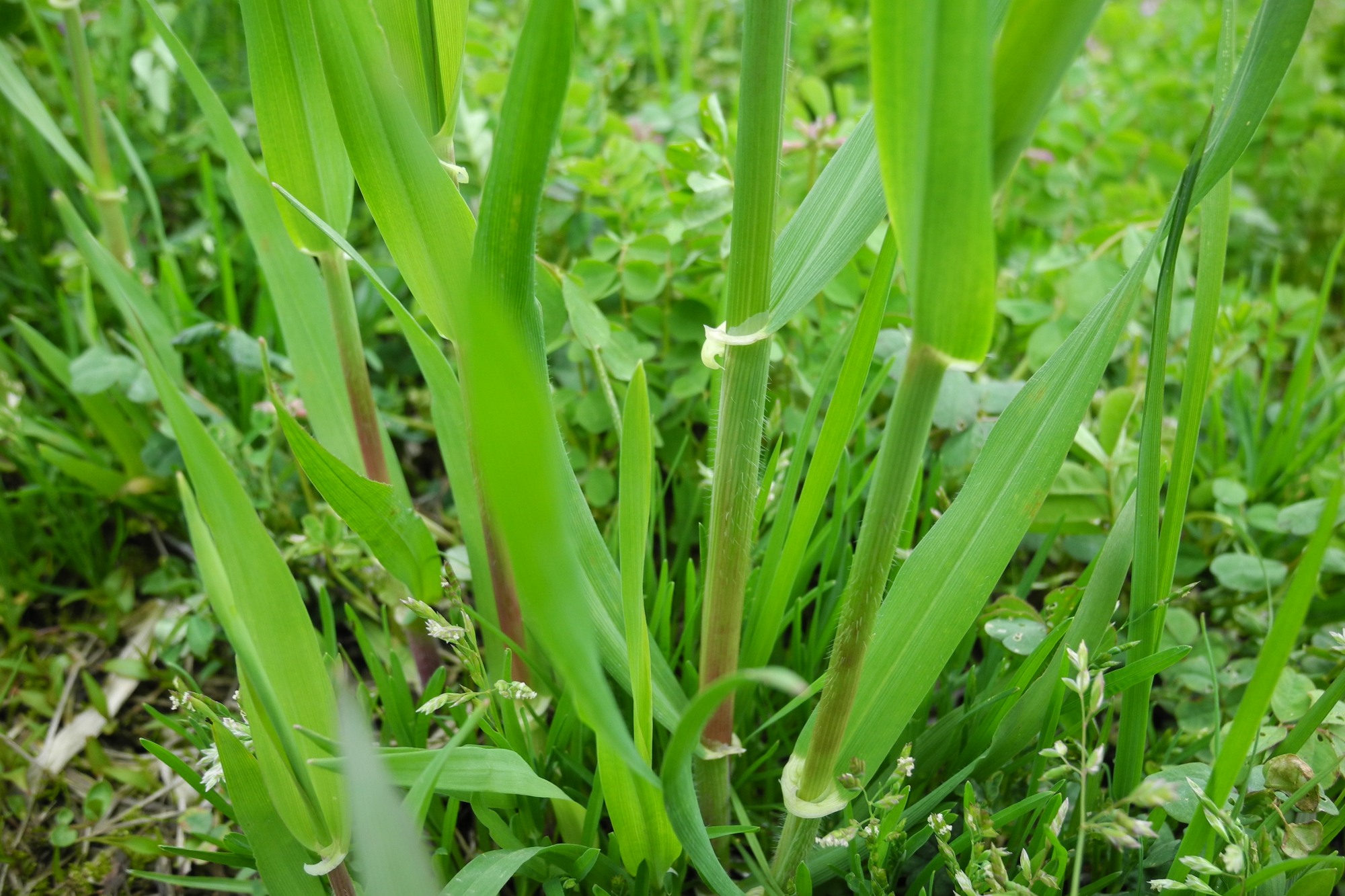 播く筋だけ草を刈っておき、10cm 間隔くらいに一粒ずつ播いていく。土は被せず、鳥除けに草だけ被せる。