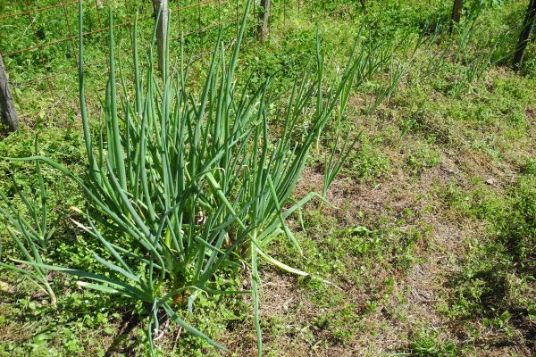 風にそよぐワイルドストローベリー。むこうのはニンニク