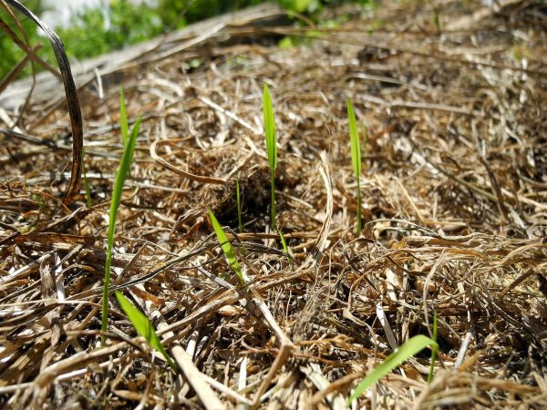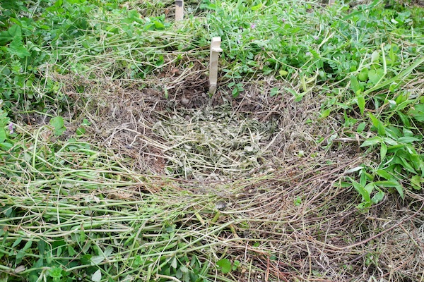 種播きや苗の移植の際は、種や苗の周囲半径 10 ㎝ ほどだけ刈ってそこへ敷き、その周りは刈らずに倒しておくだけ。