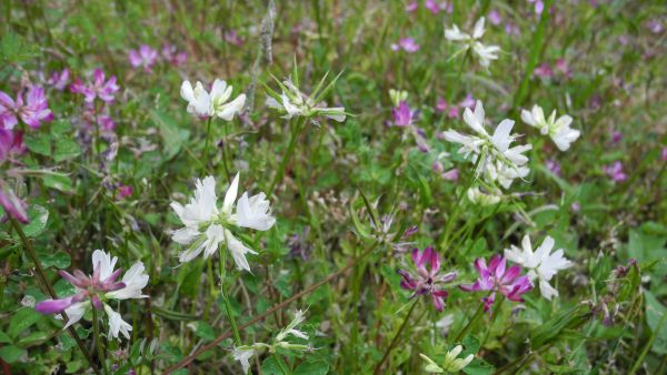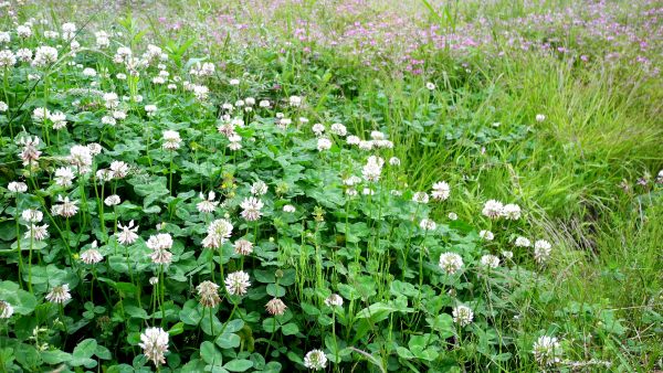 田んぼの畦の蓮華の一部がクローバーに交替し始めている。