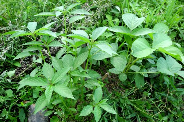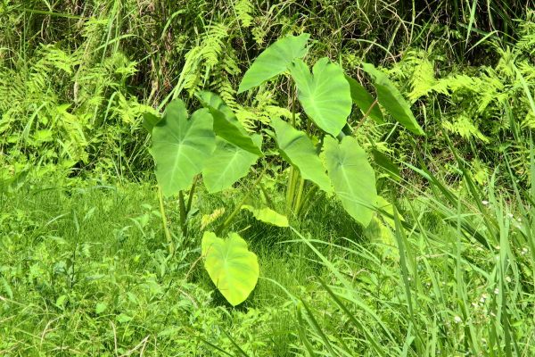 陽当たりがよくない草むらの里芋は、陽なたの畑で水不足にあえいでいる里芋よりずっと元気にしている。