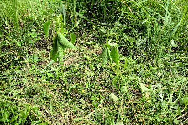 畑からずいぶん離れた草むらで、こぼれ種が発芽して育っているのを発見。
