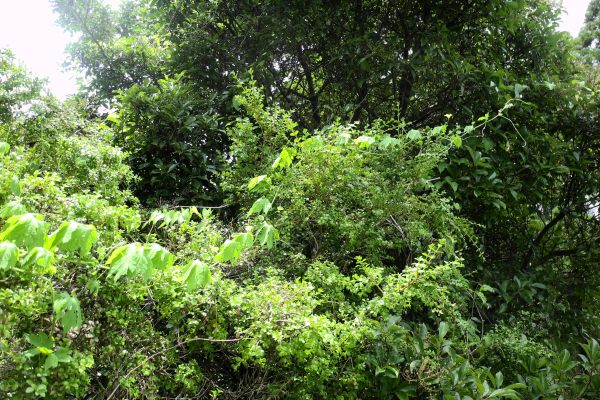 ゴーヤは傍らの木に他の蔓植物に混じってからみつき、伸び、実を付けている。