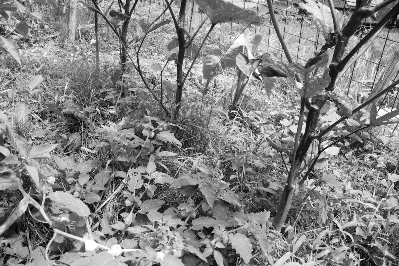 オクラの周囲で野草化しているホオズキトマト、里芋、サツマイモ。