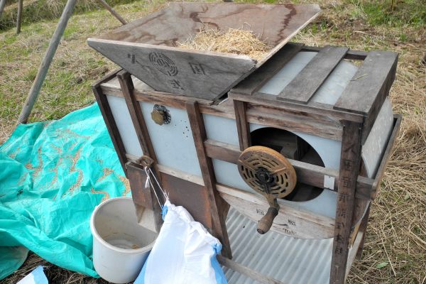 脱穀機にかけた籾をこうやって上部から入れて、右下のハンドルを回すと、下の袋とバケツに籾が入り、左にある吹き出し口からワラ屑や空の籾殻が飛び出す仕組み。