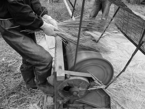 まず、これは干した稲束を足踏み脱穀機にかけて籾をワラから取り去っている所。