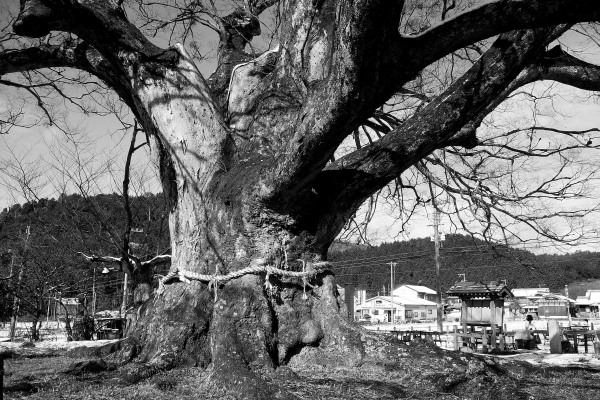 雪の残る国道から車を脇道へ滑り込ませた所、田園地帯と住宅地の端境に、大ケヤキは忽然と現われた。